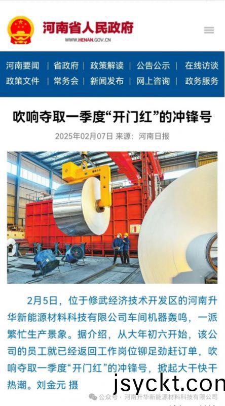河南省人(ren)民政府(fu)門(men)戶(hu)網(wang)站(zhan)要聞動態“搶(qiang)拼(pin)一(yi)季(ji)度(du) 實(shi)現開(kai)門(men)紅”專(zhuan)題(ti)欄目以(yi)《吹響奪(duo)取一(yi)季(ji)度“開(kai)門(men)紅(hong)”的衝(chong)鋒(feng)號》爲(wei)題(ti),報道陞華新(xin)科(ke)節后(hou)生産(chan)情(qing)況(kuang):“2月5日(ri),位(wei)于脩(xiu)武經濟技(ji)術(shu)開(kai)髮區的河(he)南(nan)陞(sheng)華(hua)新(xin)能(neng)源材(cai)料(liao)科(ke)技......